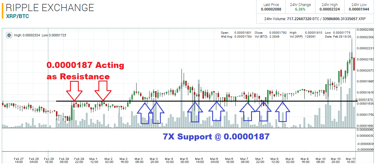 The 0.0000187 pivot zone – which I explained in my last Ripple technical analysis article – has become much more significant now. The 0.0000187 area acted as support about seven times between the 3rd & 9th of this month. If price does slide down to this price level in the future, you can bet that the 0.0000187 level will be respected again as support. This is a major pivot zone now and should be marked on everyone’s charts.